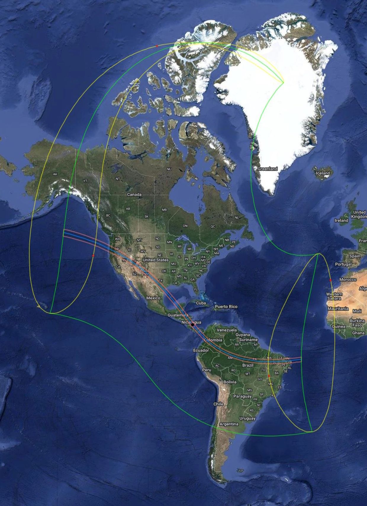 As in 2017, the 2023 eclipse entered the US at the Oregon coast; this time however, Salem was not in its path. (Though a small 1600 sq mi area lies within the paths of totality/annularity of both eclipses, the two centerlines intersect offshore.) The path of annularity (PoA, or antumbral path) moved southeast towards Texas where the centerline slipped into the Gulf of Mexico at Corpus Christi. Crossing the Yucatan Peninsula, the antumbra proceeded over land and water through Guatemala, Belize, Honduras, Nicaragua, Costa Rica and Panama, eventually entering South America at Colombia. From there it swept across the northern half of Brazil, finally exiting the country's far eastern shore at Nova Cruz in the state of Rio Grande do Norte.